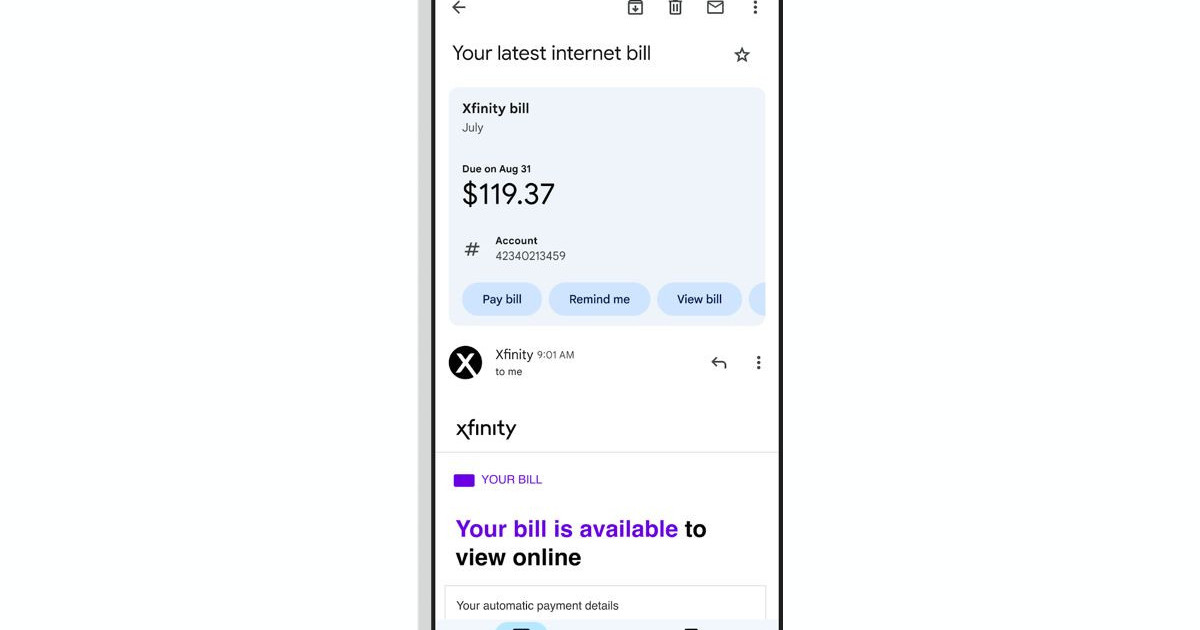 Ορισμένες από τις συνοπτικές κάρτες έχουν ήδη ξεκινήσει να εμφανίζονται, όπως αυτή για τα γεγονότα και αυτή για τις αγορές. Τώρα, οι χρήστες του Gmail σε iOS και Android μπορούν να λάβουν μια συνοπτική κάρτα για ένα email που έλαβαν και περιέχει έναν λογαριασμό που πρέπει να πληρωθεί. Αυτό ανακοινώθηκε μέσω του Google Workplace και ως παράδειγμα εμφανίζεται μια συνοπτική κάρτα για έναν λογαριασμό της Xfinity. Τρία κουμπιά δίνουν στον παραλήπτη τη δυνατότητα να πληρώσει τον λογαριασμό, να ορίσει μια υπενθύμιση για την πληρωμή του λογαριασμού ή να προβάλει τον λογαριασμό.
