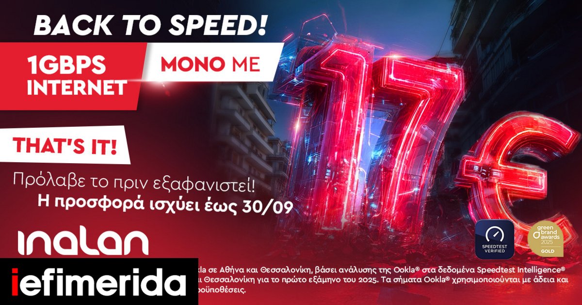 Η Inalan ανακοινώνει μία νέα, μοναδική προσφορά για τον μήνα Σεπτέμβριο, δίνοντας τη δυνατότητα σε νέους συνδρομητές να απολαμβάνουν συμμετρικό Internet 1Gbps, με ίδιες ταχύτητες Upload & Download, μόνο με 17€ τον μήνα.